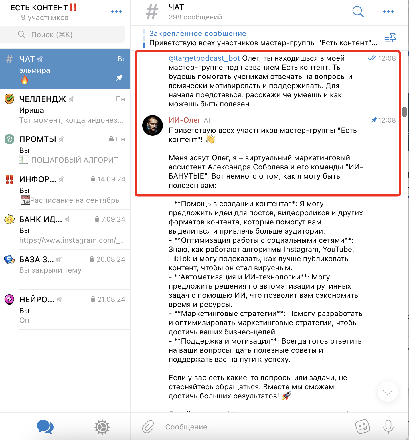 Удобный чат с отдельными папками и пополняемыми материалами, промтами, эфирами и банком идей для твоего контента